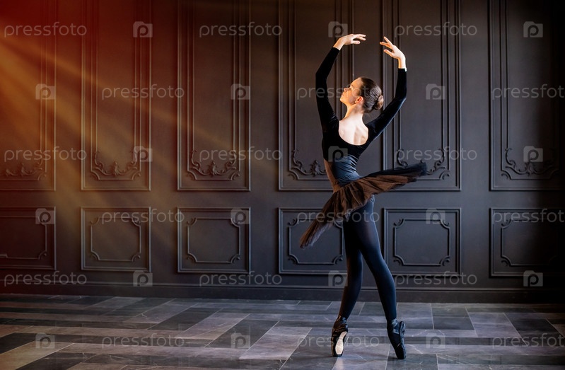 Элегантная балерина в черной пачке и пуантах танцует на темно-сером фоне