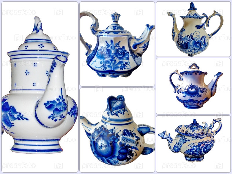 Фотоколлаж чайников в традиционном классическом стиле Гжель на белом изолированном фоне. Гжель- русское народное ремесло по изготовлению керамики и фарфора