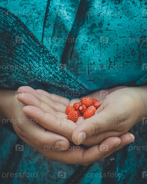 Ладони девушки с клубникой. Клубника на ладони. Селективный фокус, зернистость пленки