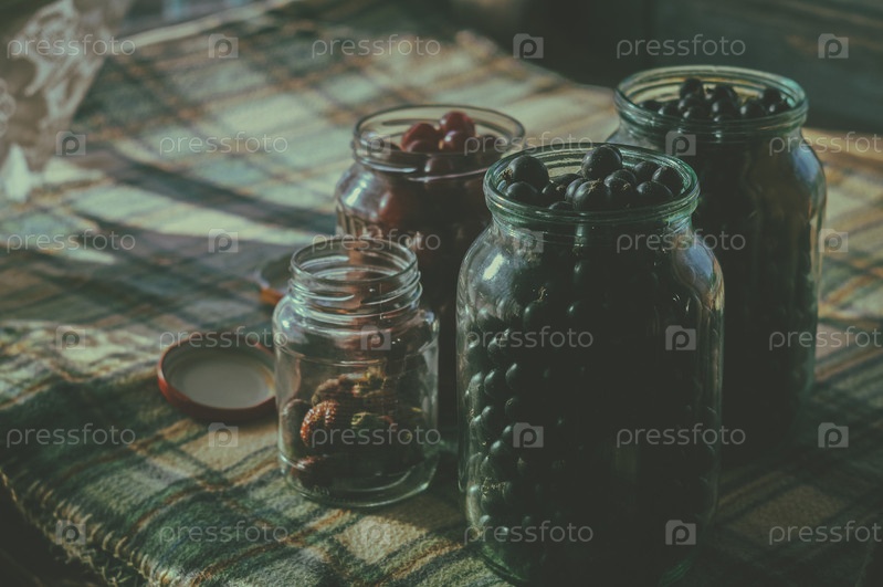 Свежие ягоды из частного сада в стеклянных банках на клетчатом одеяле. Сбор ягод черной смородины, вишни и клубники. Выборочный фокус