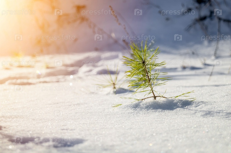 Из-под снега торчит размытый росток молодой сосны. Зимний пейзаж с хвойным лесом. Выборочный фокус