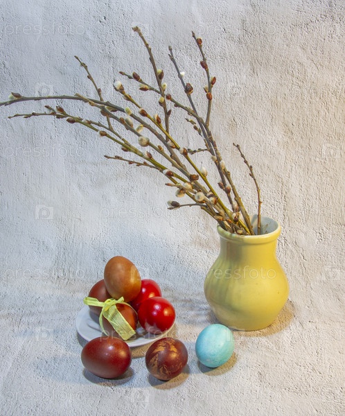 Пасхальные яйца и ветки вербы. пасхальная композиция