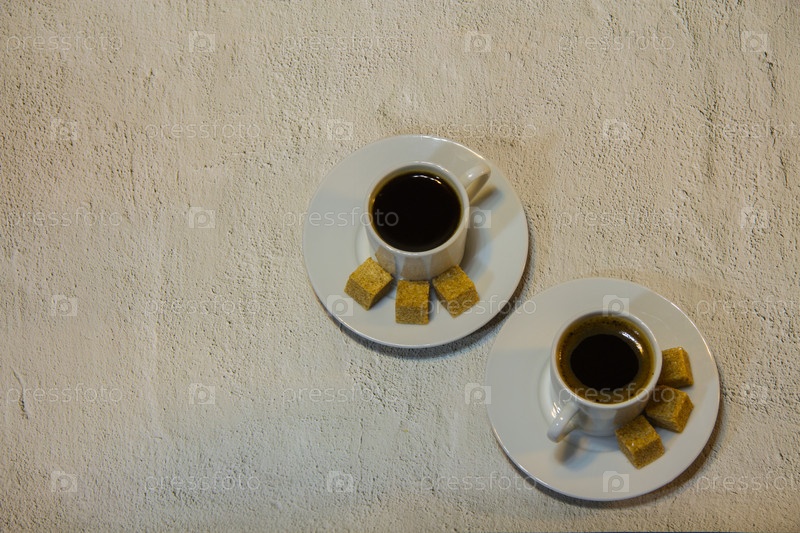 Две белые чашки с черным кофе и кусочками тростникового сахара