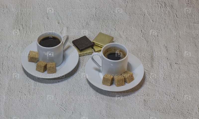 Две белые чашки с черным кофе и кусочками тростникового сахара