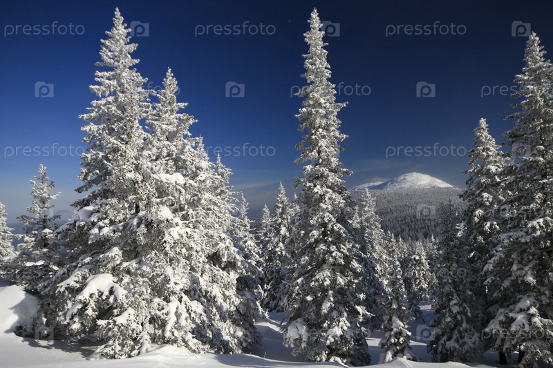 Хвойный лес в снегу в ясный зимний день. Зимний пейзаж с горной вершиной на заднем плане
