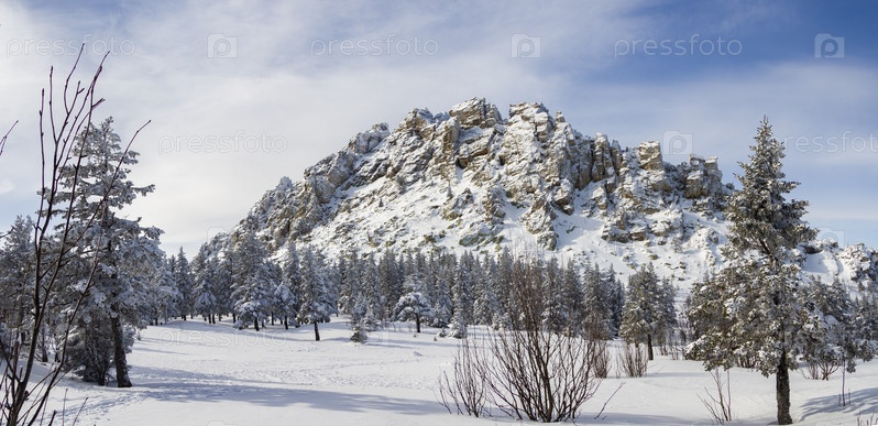 Хвойный лес в снегу в ясный зимний день. Зимний пейзаж с горной вершиной на заднем плане