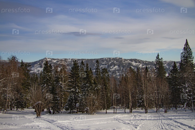 Хвойный лес в снегу в ясный зимний день. Зимний пейзаж с горной вершиной на заднем плане