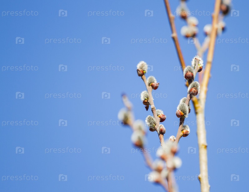 Ветки ивы с почками в весеннем лесу на фоне голубого неба