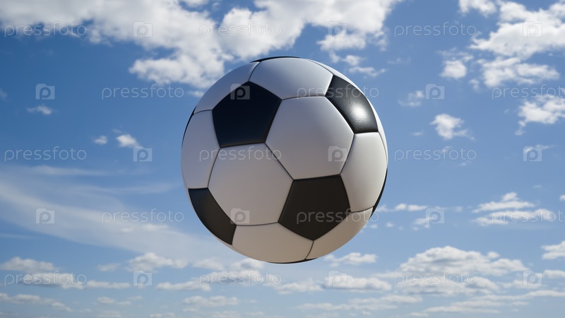 Крупный план футбольного мяча в полете. Небо на заднем плане