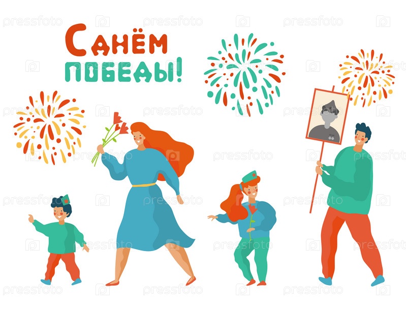Векторная иллюстрация. Установить День Победы. Люди на параде Победы. Дети, родители. Мужчина несет плакат бессмертного полка. Ручная надпись 9 мая, с Днем Победы. Русский перевод: 9 мая
