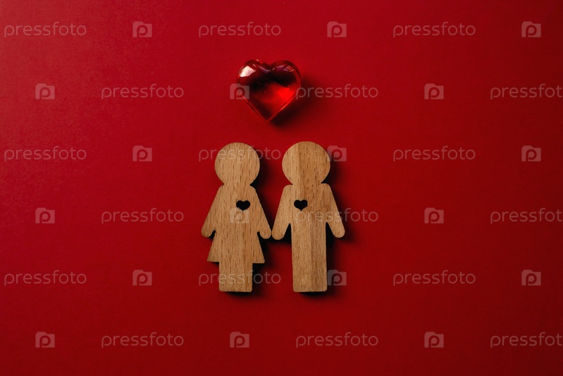 Праздничная открытка. Большое сердце из бумаги, мужчина и женщина на красном фоне. День Святого Валентина
