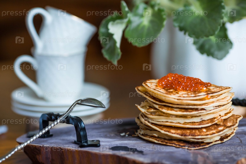 Вкусные блинчики с красной икрой. Русская и украинская кухня. Концепция русского праздника Масленица