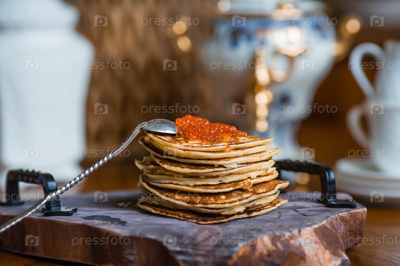 Вкусные блинчики с красной икрой. Русская и украинская кухня. Концепция русского праздника Масленица
