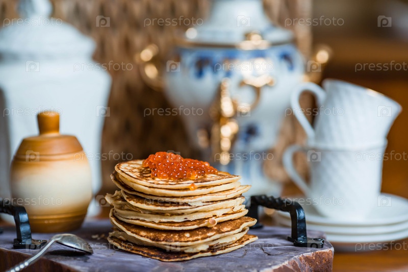 Вкусные блинчики с красной икрой. Русская и украинская кухня. Концепция русского праздника Масленица