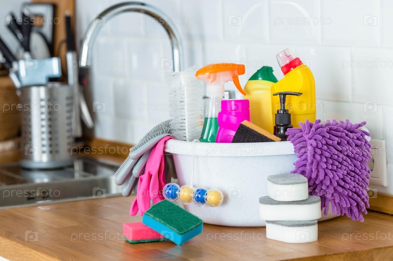 Чистящие средства на деревянном столе с размытым фоном современной кухни. Красочный набор для стирки с копировальным местом для текста
