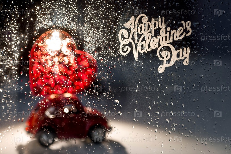 Красная ретро машинка с сердцем на крыше за дождливым окном. Доставка еды из кафе и ресторанов в День святого Валентина. Блокировка, ограничения и грусть в городе из-за коронавируса