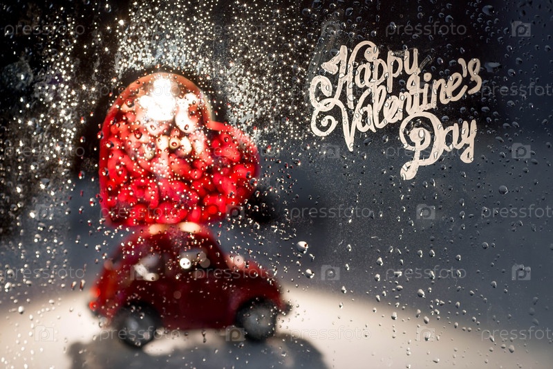 Красная ретро машинка с сердцем на крыше за дождливым окном. Доставка еды из кафе и ресторанов в День святого Валентина. Блокировка, ограничения и грусть в городе из-за коронавируса