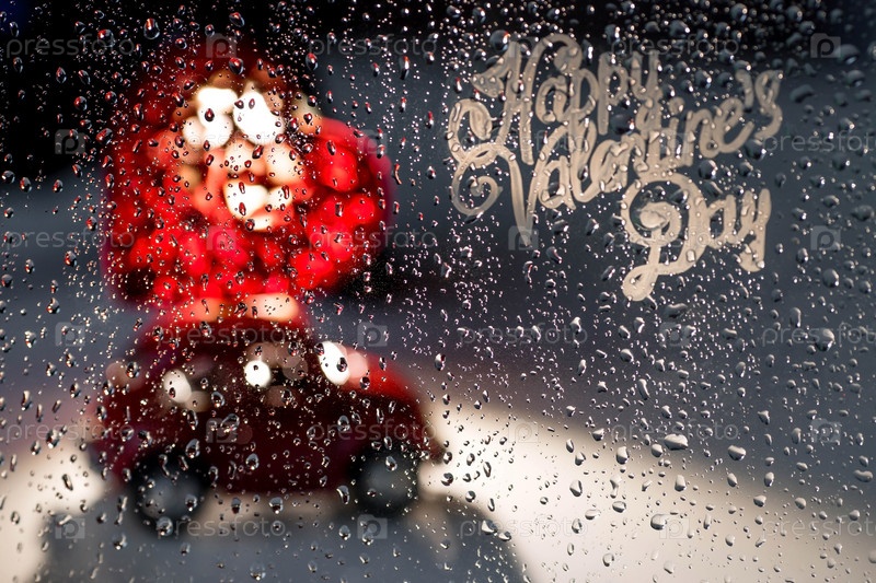 Красная ретро машинка с сердцем на крыше за дождливым окном. Доставка еды из кафе и ресторанов в День святого Валентина. Блокировка, ограничения и грусть в городе из-за коронавируса