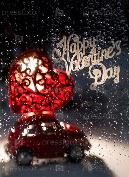 Красная ретро машинка с сердцем на крыше за дождливым окном. Доставка еды из кафе и ресторанов в День святого Валентина. Блокировка, ограничения и грусть в городе из-за коронавируса