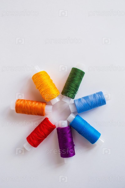 Портной рабочее место с разноцветными катушками ниток. Шитье как хобби. Вид сверху на белом фоне. Минимальный стиль