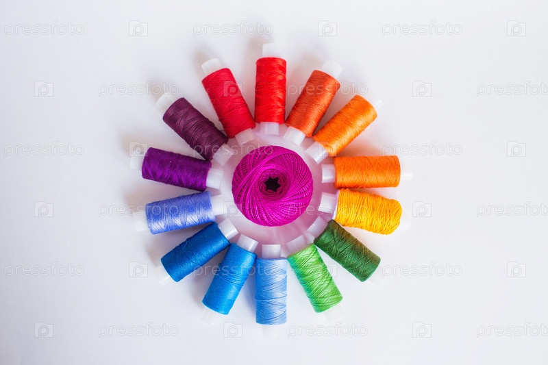 Портной рабочее место с разноцветными катушками ниток. Шитье как хобби. Вид сверху на белом фоне. Минимальный стиль