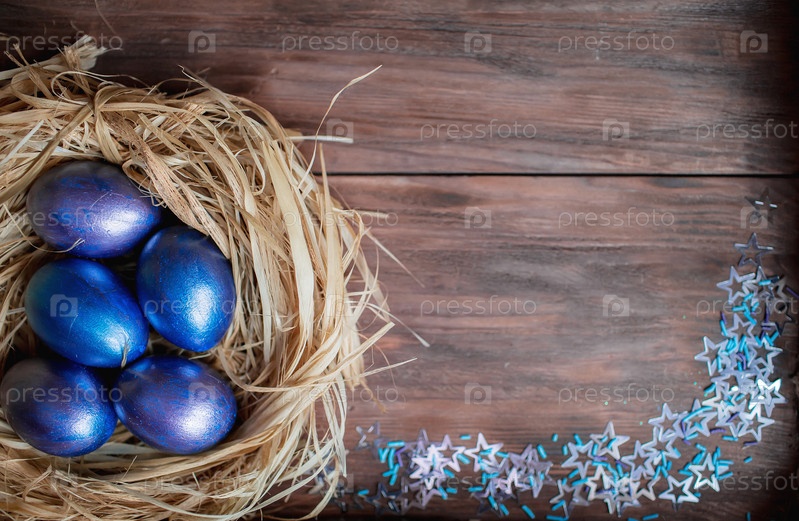 Голубые пасхальные яйца в гнезде на деревянном фоне. Минимальная пасхальная концепция. Пасхальная открытка с местом для копирования текста