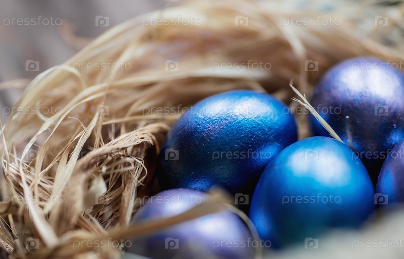 Голубые пасхальные яйца в гнезде на деревянном фоне. Минимальная пасхальная концепция. Пасхальная открытка с местом для копирования текста