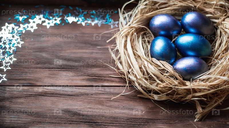 Голубые пасхальные яйца в гнезде на деревянном фоне. Минимальная пасхальная концепция. Пасхальная открытка с местом для копирования текста