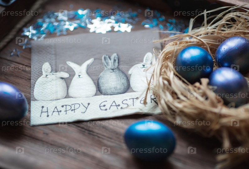 Голубые пасхальные яйца в гнезде на деревянном фоне. Минимальная пасхальная концепция. Пасхальная открытка с местом для копирования текста