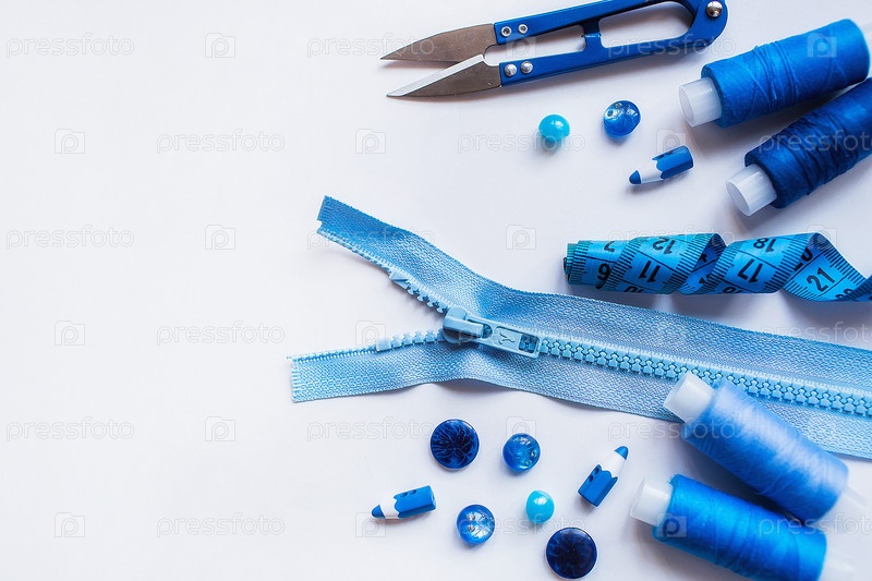 Место работы портного с голубыми нитками. Шитье как хобби. Белый фон. Детали крупным планом