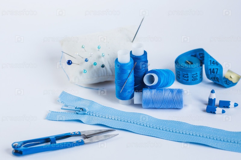 Место работы портного с голубыми нитками. Шитье как хобби. Белый фон. Детали крупным планом