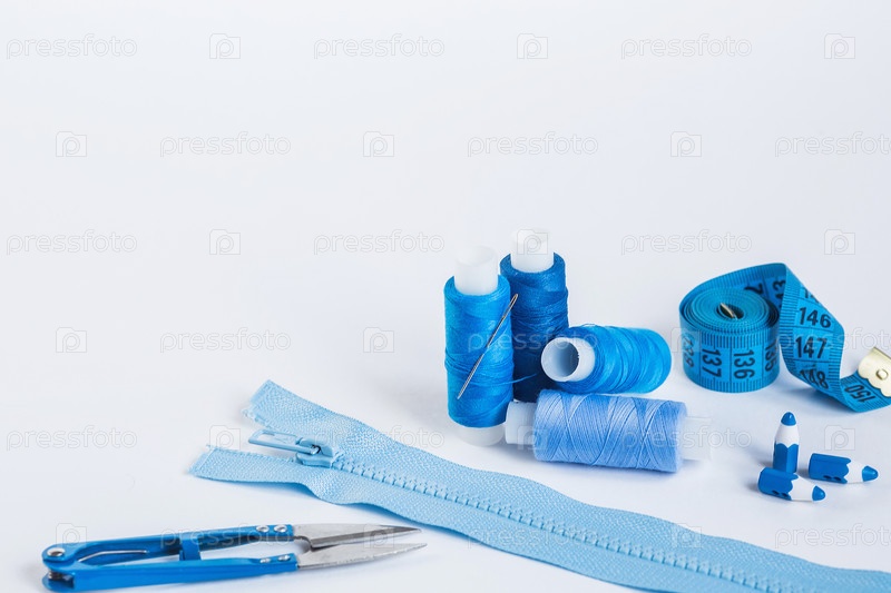 Место работы портного с голубыми нитками. Шитье как хобби. Белый фон. Детали крупным планом
