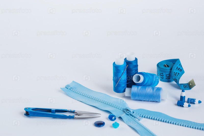 Место работы портного с голубыми нитками. Шитье как хобби. Белый фон. Детали крупным планом