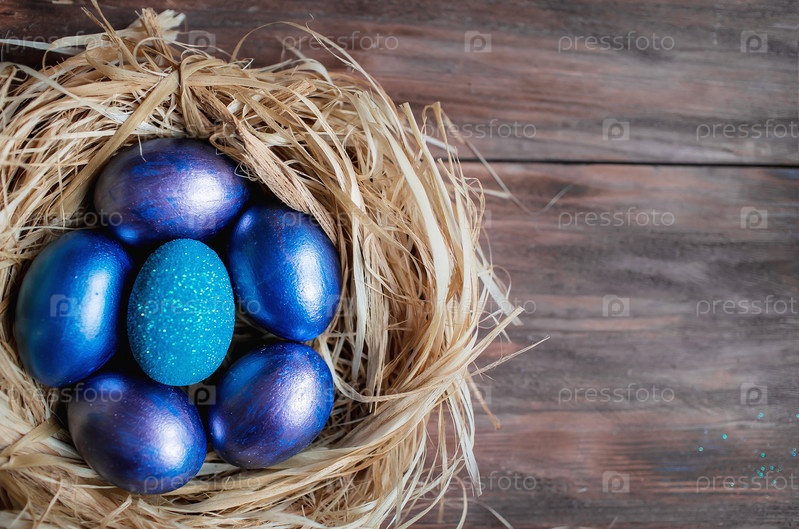 Голубые пасхальные яйца в гнезде на деревянном фоне. Минимальная пасхальная концепция. Пасхальная открытка с местом для копирования текста