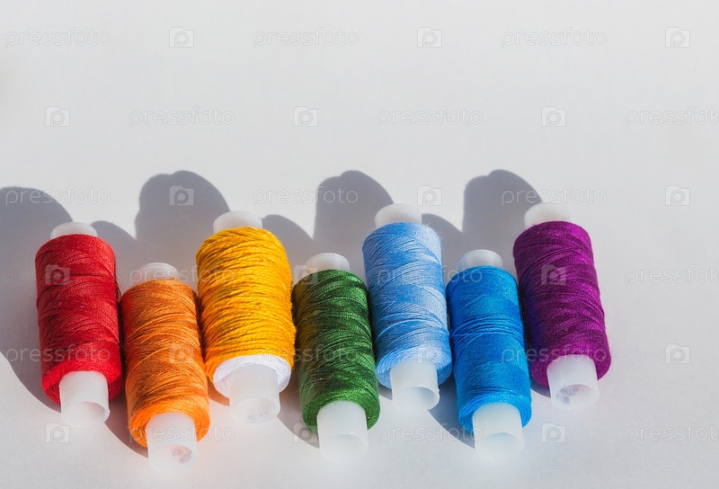 Портной рабочее место с разноцветными катушками ниток. Шитье как хобби. Вид сверху на белом фоне. Минимальный стиль