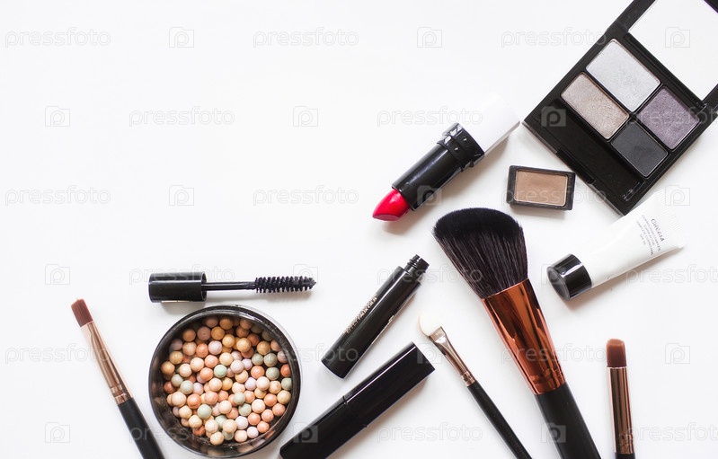 Кисть для макияжа и декоративная косметика на белом фоне с пустым пространством. Вид сверху