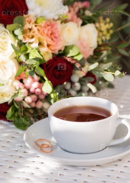 Чашка чая, лепестки роз, золотые обручальные кольца и красивый букет на белом столе. Концепция свадебного торжества. Утро невесты