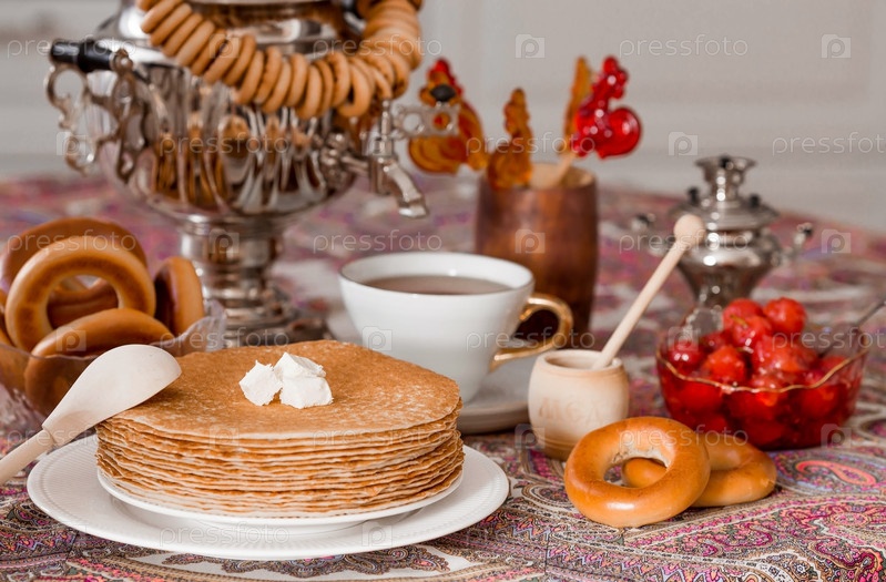 Русские традиции. Русский праздник Масленица. Натюрморт с чашкой чая, стопкой блинов, сметаной, медом, кубиками масла, рогаликами, сухофруктами, карамельным петушком и самоварами
