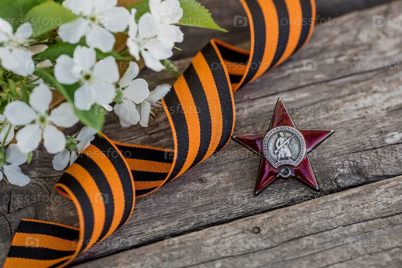 Георгиевская лента и орден Красной Звезды ветерана Великой Отечественной войны СССР на деревянном фоне. Перевод на русский язык: Рабочие всех стран объединяйтесь. Концепция праздника 9 мая