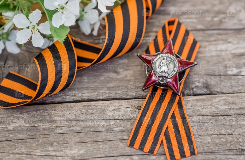 Георгиевская лента и орден Красной Звезды ветерана Великой Отечественной войны СССР на деревянном фоне. Перевод на русский язык: Рабочие всех стран объединяйтесь. Концепция праздника 9 мая