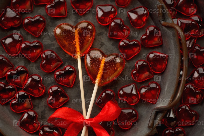 Два леденца. Красные сердца. Концепция конфетной любви. День Святого Валентина. Скопируйте место для надписей