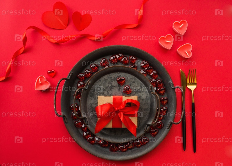 Старинные тарелки, праздничная сервировка стола с подарочной коробкой на красном фоне. Концепция любви. День Святого Валентина