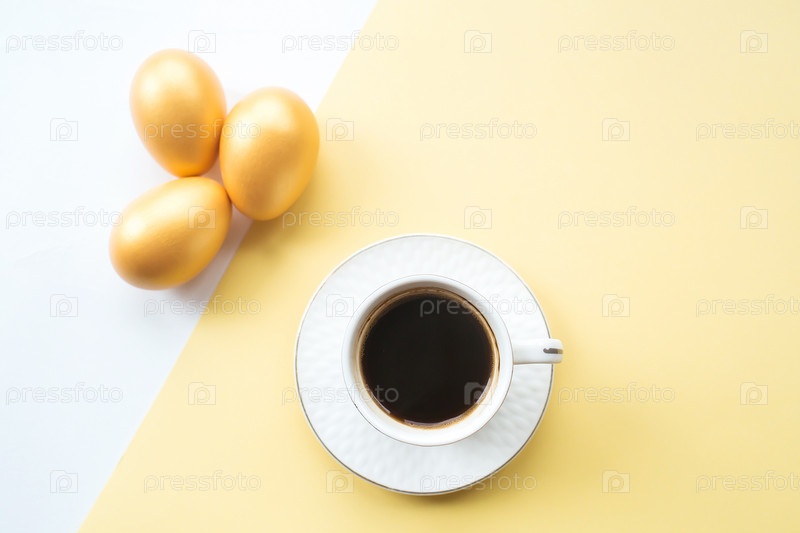 Золотые пасхальные яйца и кружка кофе на желтом и белом фоне. Вид сверху. Минимальная концепция
