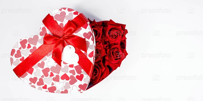 День Святого Валентина. Красные розы в белой коробке в виде сердца на белом фоне. Подарок женщинам на праздник. Концепция доставки цветов. флористика и цветочные магазины. Копировать пространство