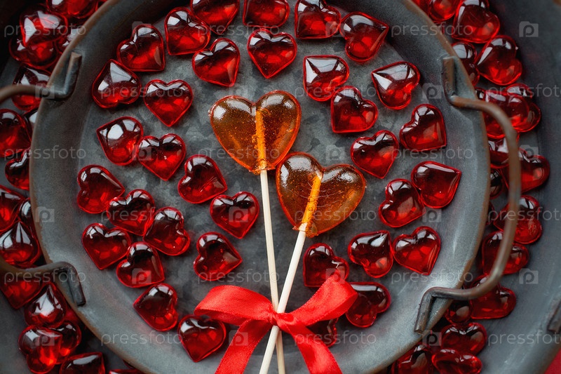 Два леденца. Красные сердца. Концепция конфетной любви. День Святого Валентина. Скопируйте место для надписей