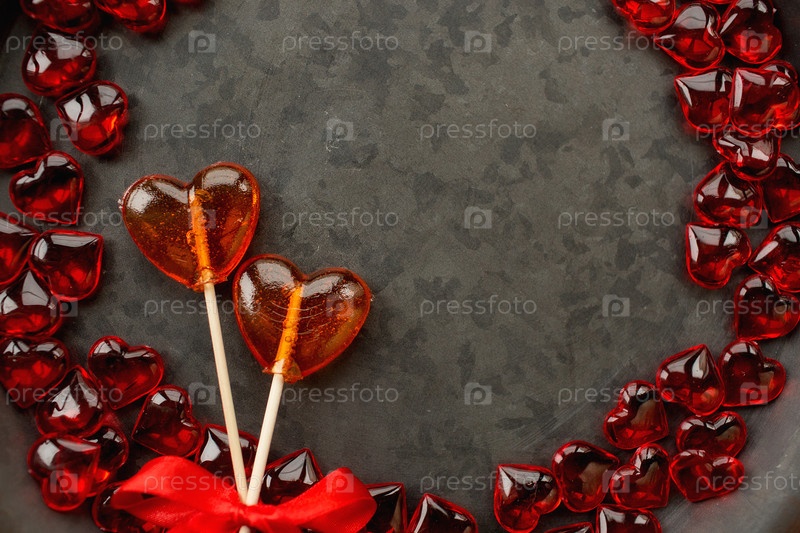 Два леденца. Красные сердца. Концепция конфетной любви. День Святого Валентина. Скопируйте место для надписей