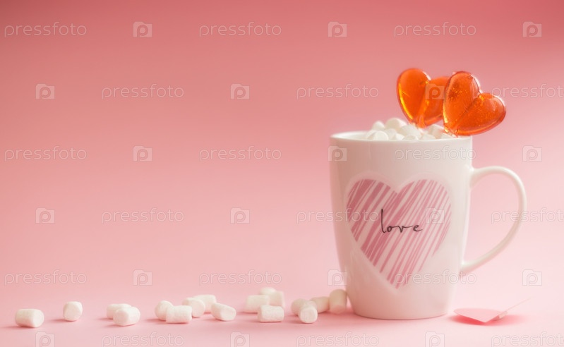 Баннер. Кружка со сладостями и зефиром на розовом фоне. Романтика, день святого валентина. Концепция праздника. Сезонный зимний февральский праздник, женщина, день матери