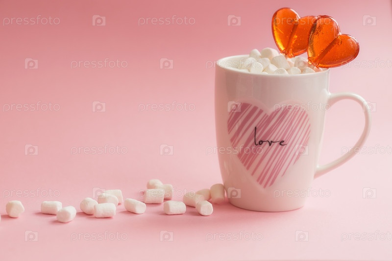 Баннер. Кружка со сладостями и зефиром на розовом фоне. Романтика, день святого валентина. Концепция праздника. Сезонный зимний февральский праздник, женщина, день матери