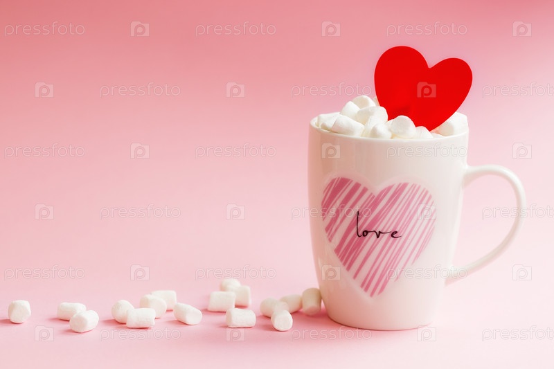 Баннер. Кружка со сладостями и зефиром на розовом фоне. Романтика, день святого валентина. Концепция праздника. Сезонный зимний февральский праздник, женщина, день матери