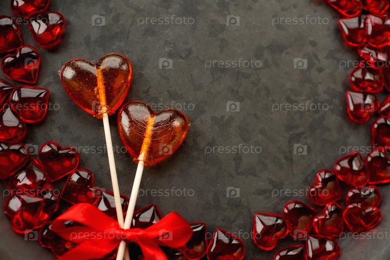 Два леденца. Красные сердца. Концепция конфетной любви. День Святого Валентина. Скопируйте место для надписей